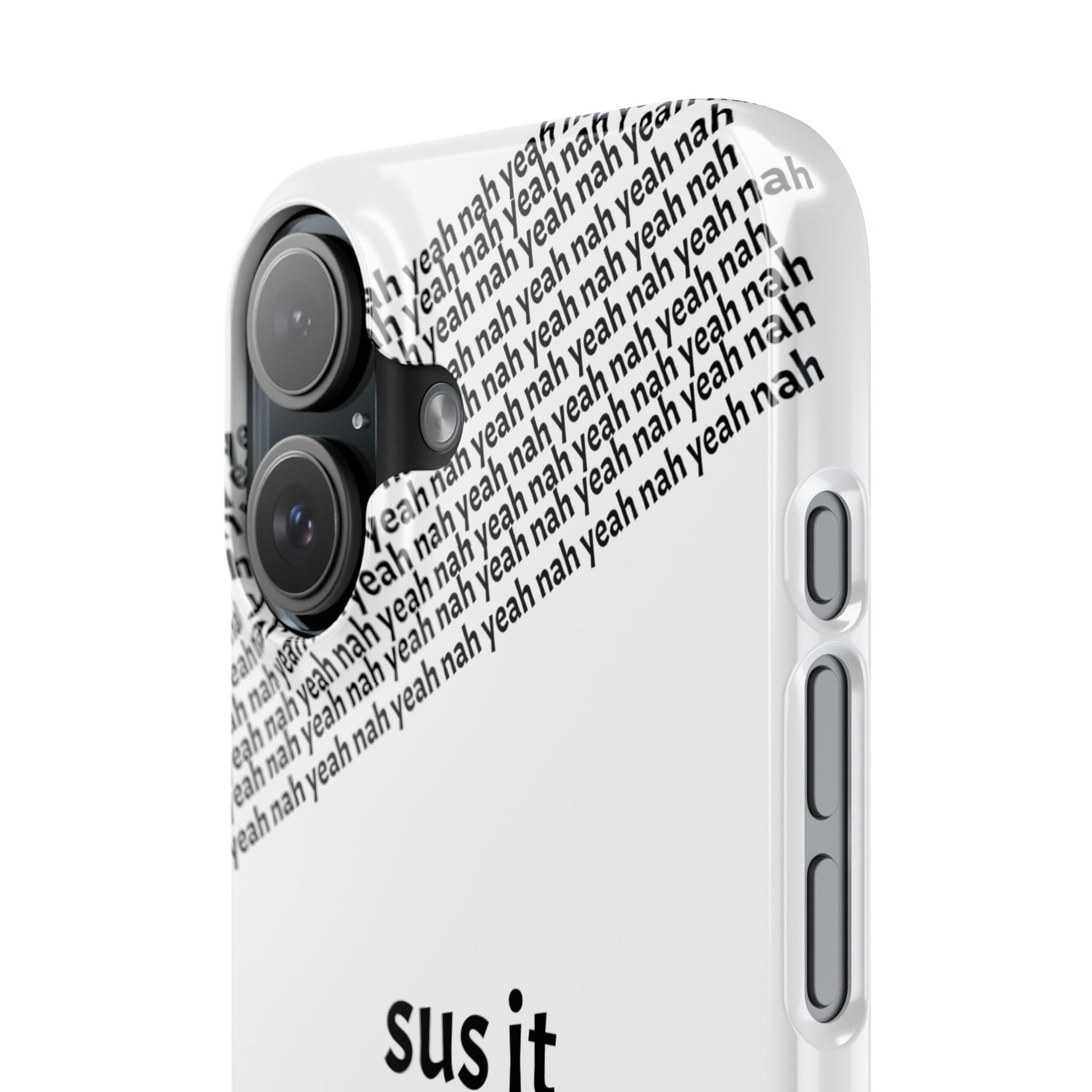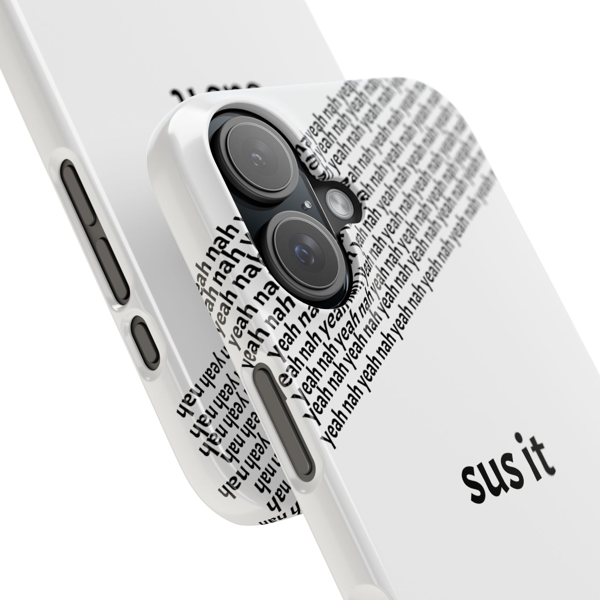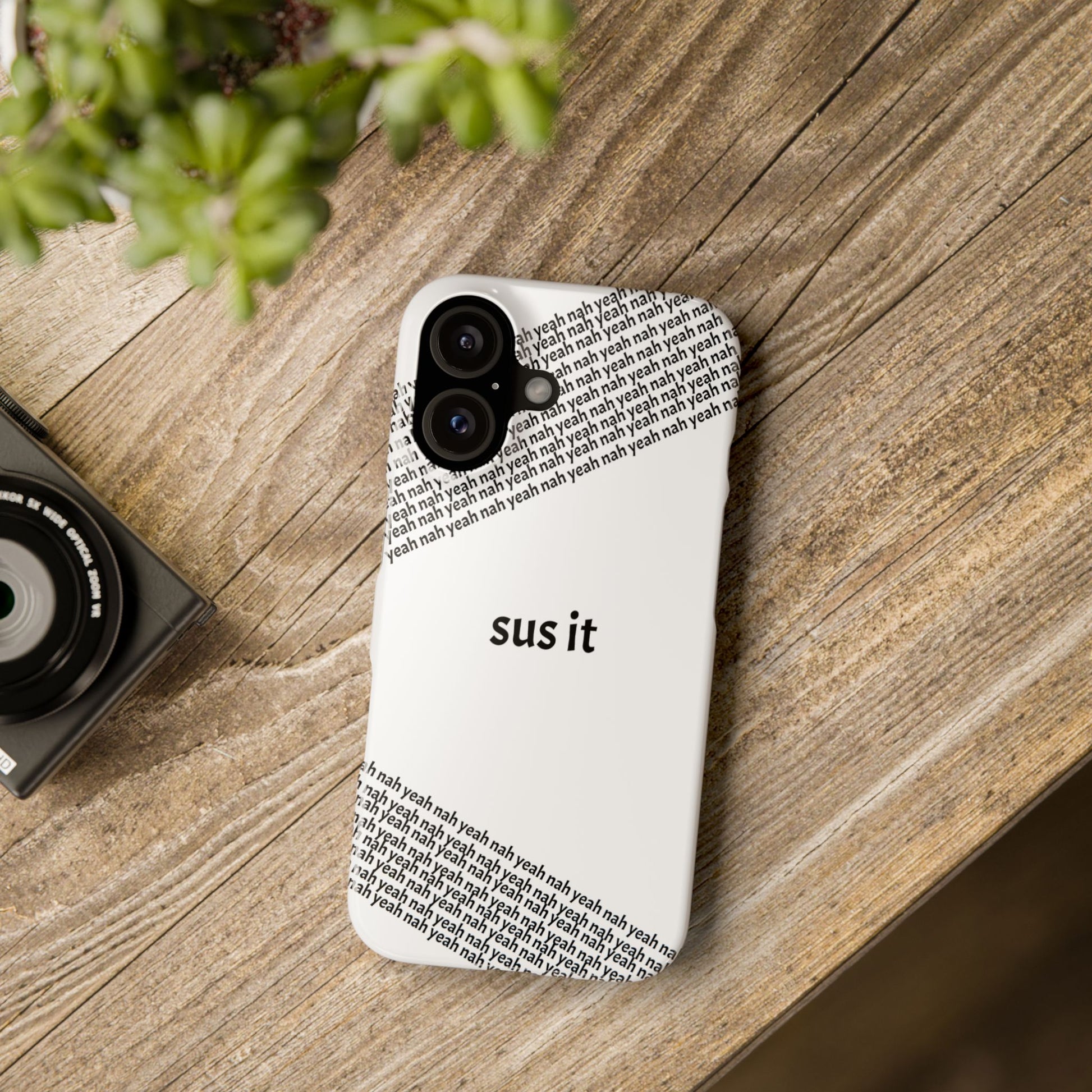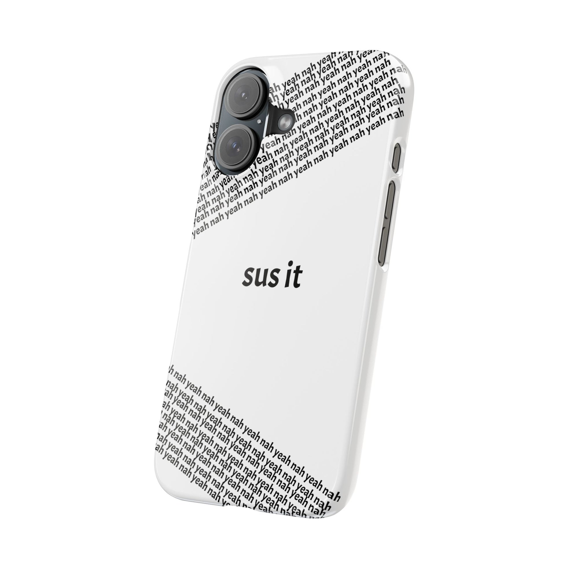 Smooth matte finish with a crisp little “SUS IT” print that says what you’re already thinkin’ when someone spins a dodgy yarn. Subtle flex, not loud about it.
